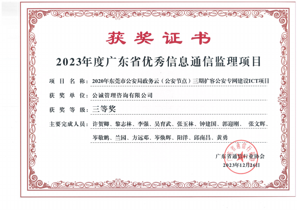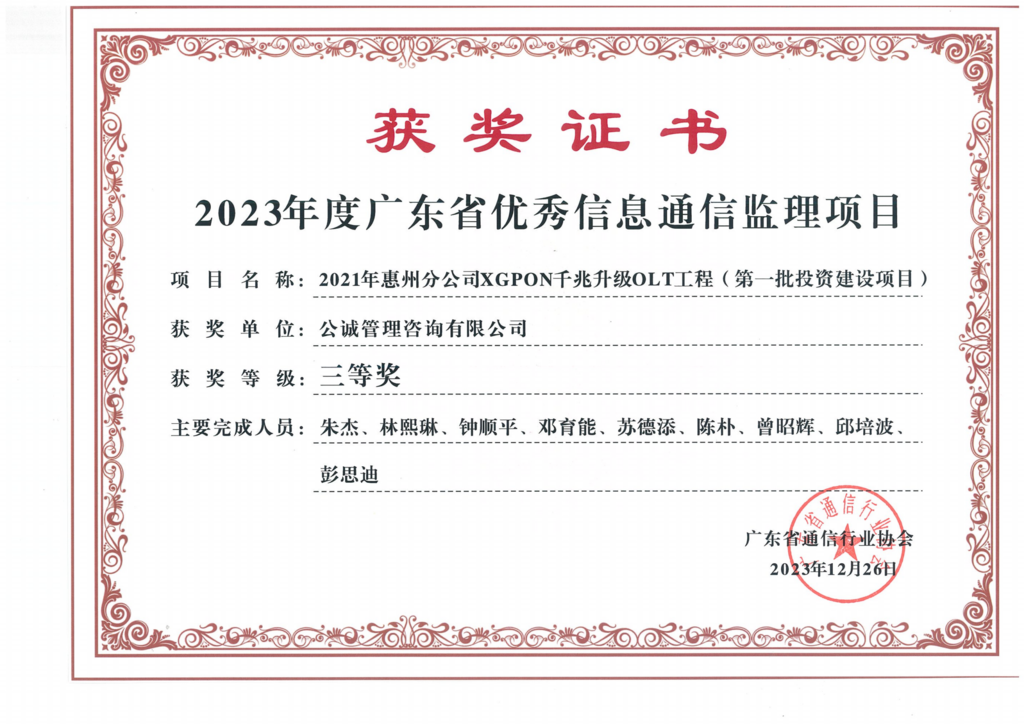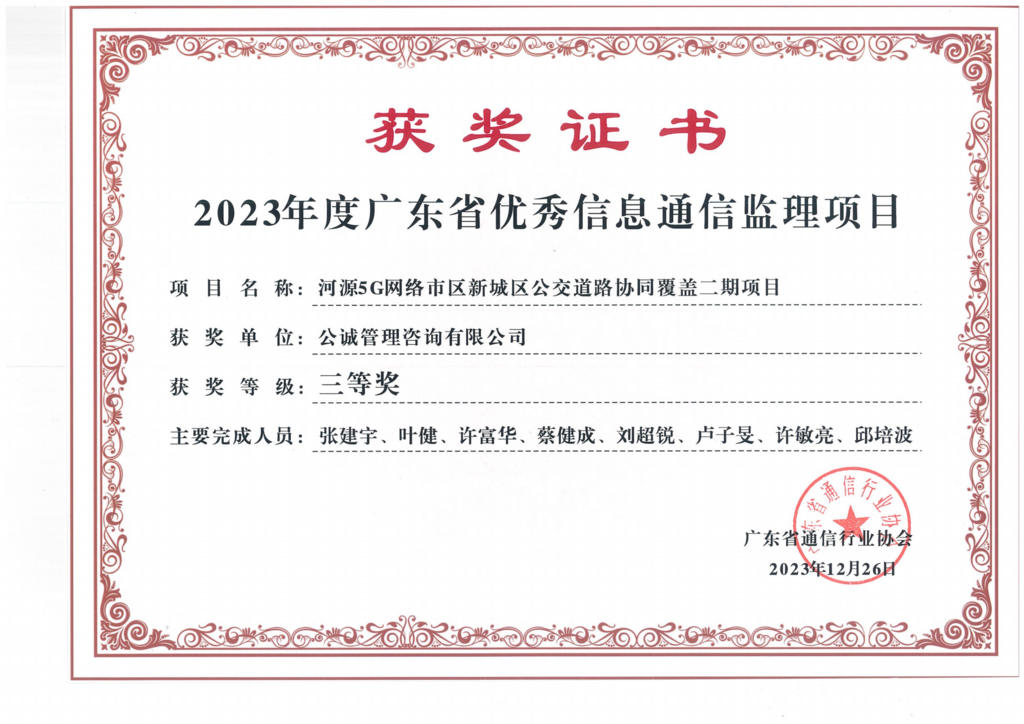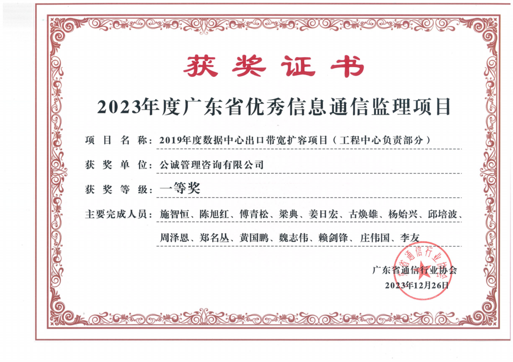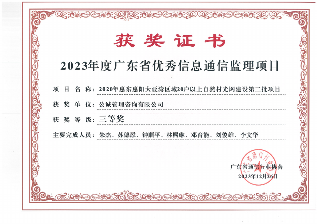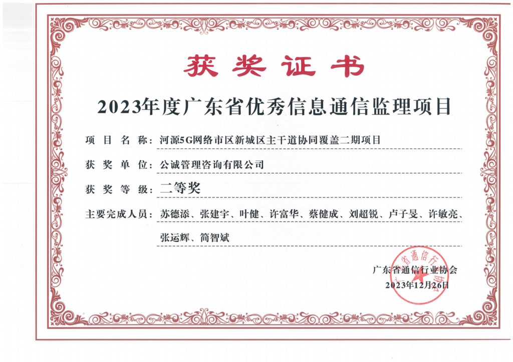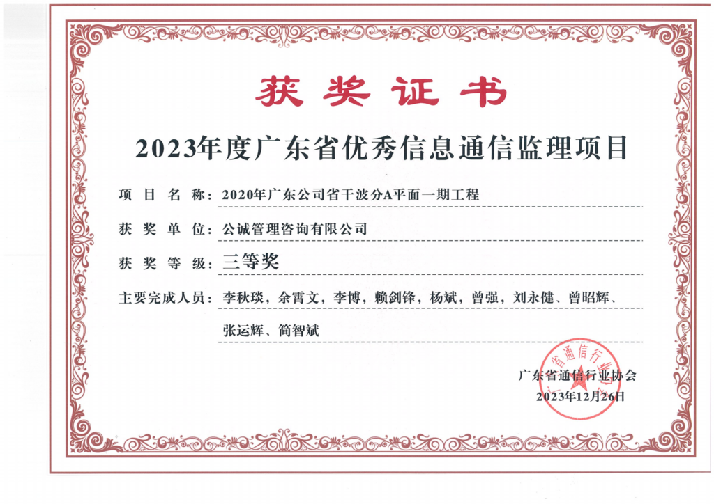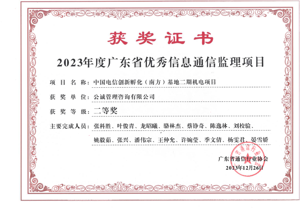 本次优秀信息通信监理项目的评选,全省有五家通信监理企业的33个监理项目参与评选,需评选出23个优秀项目,包含4个一等、8个二等,11个三等。公司送审的项目中有10个项目获得优秀项目,分别有《2019年度数据中心出口带宽扩容项目(工程中心负责部分)》、《2020年湛江数据中心一期二阶段机房电源及配套工 程》2个项目荣获一等奖项,《中国电信创新孵化(南方)基地二期机电项目》、《河源5G网络市区新城区主干道协同覆盖二期项目》2个项目荣获二等奖项,《2020年东莞市公安局政务云(公安节点)三期扩容公安专网建设ICT项目》、《2020年广东公司省干波分 A平面一期工程》、《2021年惠州分公司XGPON千兆升级OLT工程(第一批投资建设项目)》、《2020年惠东惠阳大亚湾区域20户以上自然村光网建设第二批项目》、《2021年江门分公司开平网络提质优化集成服务项目》、《河源5G网络市区新城区公交道路协同覆盖二期项目》6个项目荣获三等奖项。